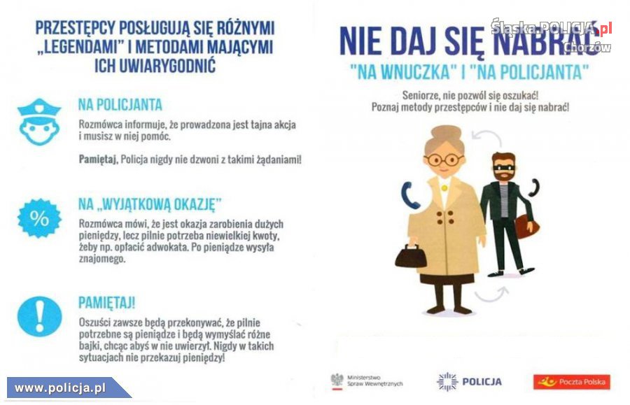 Przypominamy, że prawdziwi policjanci NIGDY nie informują o prowadzonych przez siebie sprawach telefonicznie i nigdy nie proszą o przekazanie pieniędzy nieznanej osobie. NIGDY też nie poproszą o zaangażowanie naszych pieniędzy do jakiejkolwiek akcji! Policjant, który podejmuje czynności służbowe w cywilu i nie jest umundurowany MUSI podać stopień, imię i nazwisko i okazać legitymację służbową w taki sposób, aby osoba miała możliwość odczytania numeru i nazwy organu wydającego legitymację oraznazwiska policjanta.
