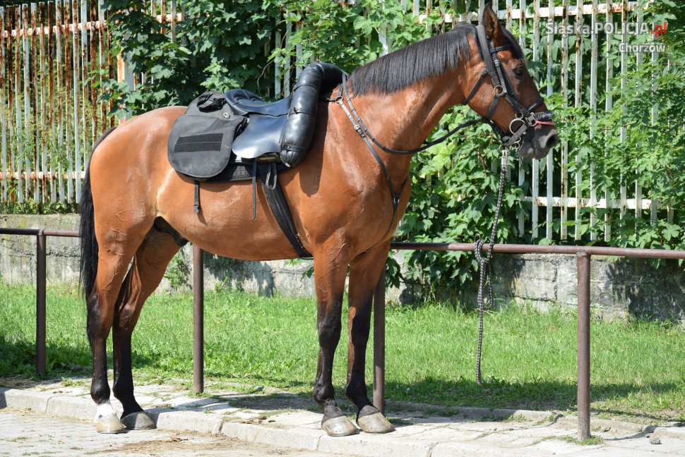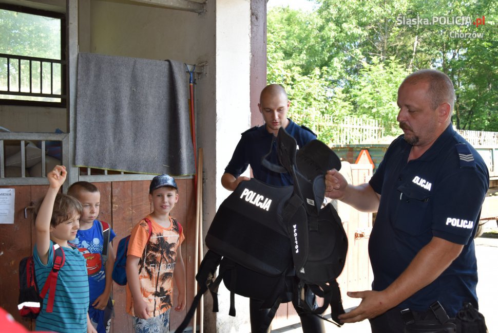 Tym razem siedzibę chorzowskiego zespołu konnego odwiedzili uczniowie I klasy Szkoły Podstawowej nr 1 w Chorzowie. Dzieci zwiedziły stajnię, ujeżdżalnię, a także mogły zobaczyć psy policyjne. Maluchy zapoznały się z pracą policjantów przy codziennej obsłudze koni oraz dowiedziały się wiele ciekawych rzeczy na temat koni. Mundurowi zaprezentowali elementy wyposażenia policjanta patrolu konnego m.in. kask, pałkę służbową i odblaski - zachęcając w ten sposób dzieci do korzystania z odblasków na drodze oraz z kasków ochronnych np. podczas jazdy na rowerze czy rolkach. W trakcie spotkania dzieci miały również okazję wysłuchać pogadanki przygotowanej przez policjanta - przewodnika psa na temat zachowania ostrożności wobec zwierząt i potrzeby dbania o psy. Dzieci dowiedziały się także, jak skutecznie obronić się przed atakiem psa. Przede wszystkim należy zachować spokój, nie uciekać, nie patrzeć psu w oczy. Gdy pies chce zaatakować należy przyjąć pozycję "żółwia". Policyjny pies „ Ares”, pod kierownictwem opiekuna, prezentował swoje umiejętności i wysoki stopień wyszkolenia. Razem zaprezentowali jak współpracją w patrolu, czego dowodem był pokaz obezwładnienia przestępcy. Uczniowie z wielkim zainteresowaniem przyglądały się, jak pies reaguje na komendy swojego przewodnika. Spotkanie dla dzieci było bardzo atrakcyjne, gdyż miały okazję zobaczyć nieco innych pracowników policji – konie i psy. Największą jednak radość sprawiło im pogłaskanie czworonogów. Dzieci na pewno na długo zapamiętają tą nietypową wizytę.