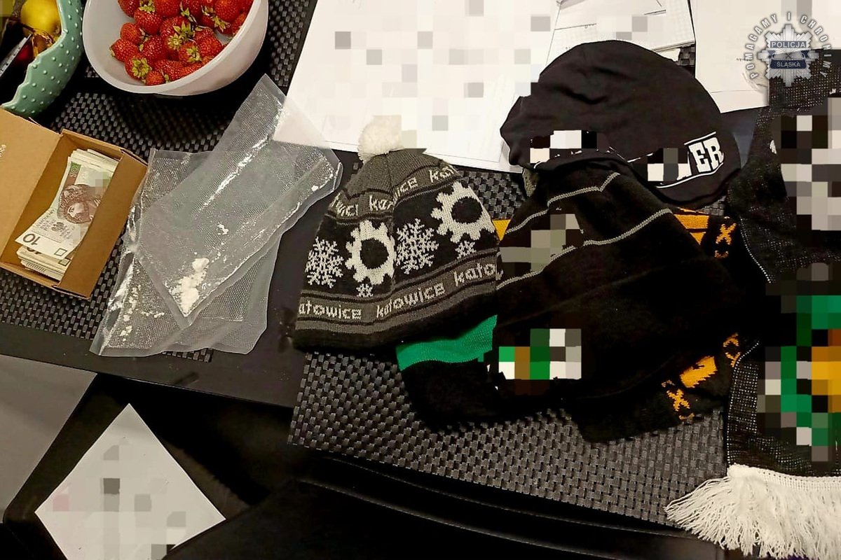 W poniedziałek, 23 czerwca br., chorzowscy i katowiccy policjanci, przy wsparciu funkcjonariuszy z Wydziału ds. Zwalczania Przestępczości Pseudokibiców KWP w Katowicach, OPP w Katowicach, KMP w Jaworznie, KMP w Mysłowicach i KMP w Rudzie Śląskiej, zatrzymali 3 mężczyzn - 21-letniego mieszkańca Mysłowic, 26-letniego mieszkańca Trzebini oraz 43-letniego mieszkańca Katowic, powiązanych ze środowiskiem pseudokibiców katowickiego klubu piłkarskiego. Kryminalni w trakcie prowadzonych przeszukań w miejscach zamieszkania mężczyzn zabezpieczyli narkotyki w postaci marihuany, amfetaminy i MDMA. Zabezpieczone zostały również pieniądze w kwocie prawie 30 tysięcy złotych. Dodatkowo u mieszańca Mysłowic policjanci zabezpieczyli broń gazową.
