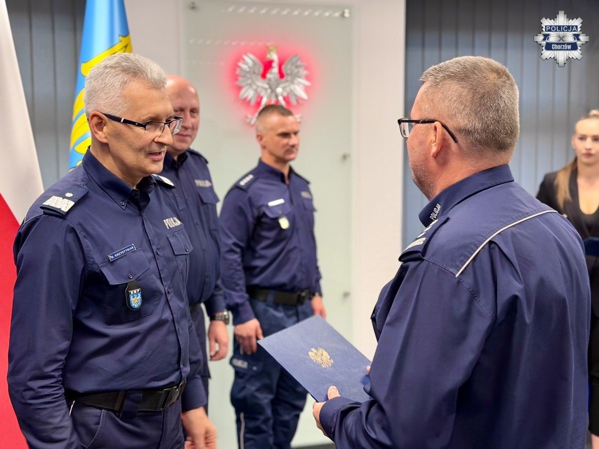 Aspirant Arkadiusz Bochenek z Komendy Miejskiej Policji w Chorzowie, najlepszy dyżurny garnizonu śląskiego, wziął udział w spotkaniu laureatów policyjnych konkursów w Katowicach. W wydarzeniu uczestniczyli komendanci oraz wyróżnieni policjanci z całego województwa. Asp. Arkadiuszowi Bochenkowi towarzyszył insp. Andrzej Brzozowski, Komendant Miejski Policji w Chorzowie.