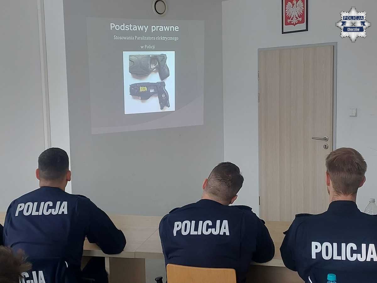 W poniedziałek i wtorek w Komendzie Miejskiej Policji w Chorzowie odbyło się specjalistyczne szkolenie dotyczące obsługi paralizatorów elektrycznych. Zajęcia skierowane były do policjantów, którzy w najbliższym czasie będą pełnić służbę z wykorzystaniem tego środka przymusu bezpośredniego. Uczestnicy zdobyli wiedzę oraz praktyczne umiejętności niezbędne do bezpiecznego i zgodnego z przepisami posługiwania się taserem.