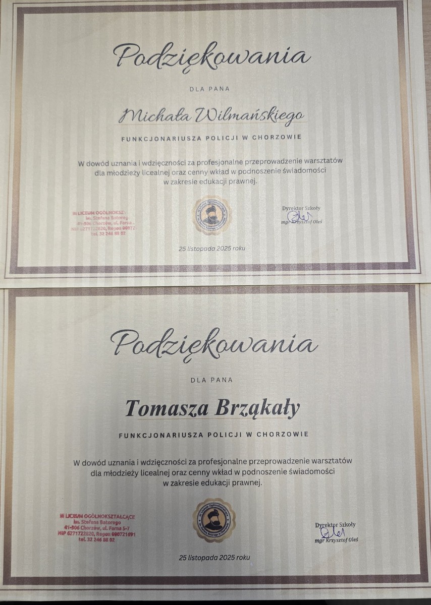 Na ręce Komendanta Komisariatu Policji I w Chorzowie wpłynęły podziękowania dla dzielnicowych z chorzowskiej „jedynki”, którzy przeprowadzili warsztaty dla młodzieży z III Liceum Ogólnokształcącego im. Stefana Batorego w Chorzowie oraz za ich cenny wkład w podnoszenie świadomości uczniów w zakresie edukacji prawnej. Poniżej publikujemy treść podziękowań.