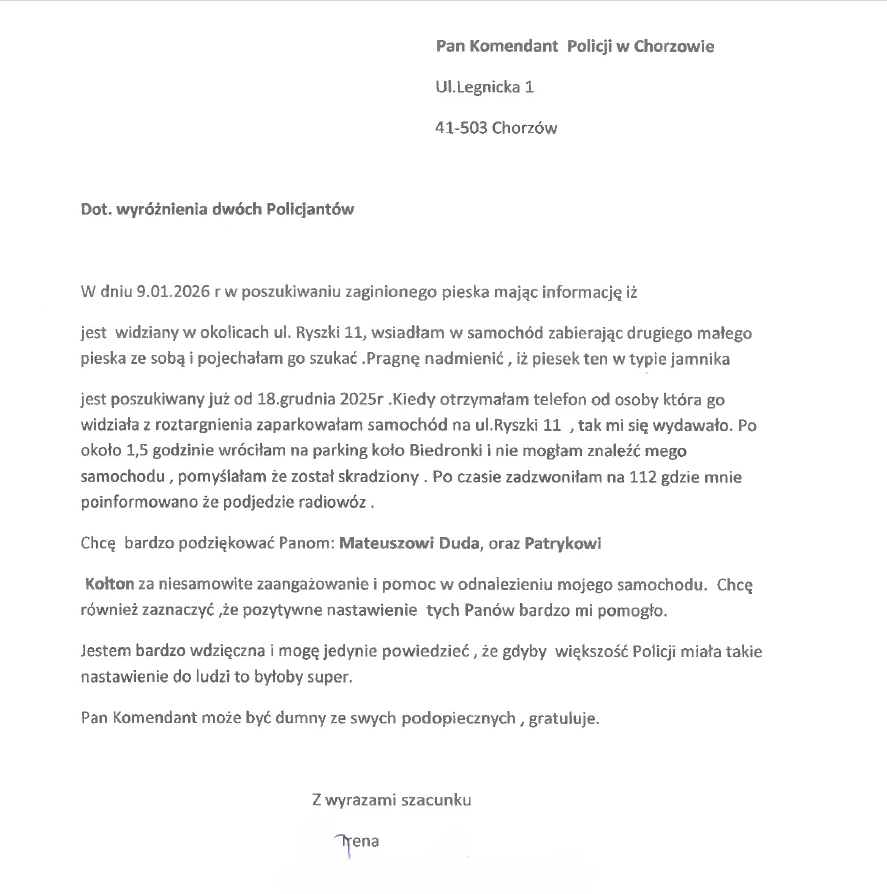 Na ręce Komendanta Miejskiego Policji w Chorzowie wpłynęły kolejne podziękowania dla policjantów. Tym razem od pani Ireny, która wyraziła wdzięczność wobec policjantów za pomoc w odnalezieniu samochodu. Dzięki szybkiej i zdecydowanej reakcji policjantów udało się sprawnie rozwiązać problem. Ich zaangażowanie, życzliwość i gotowość do niesienia pomocy spotkały się z dużym uznaniem. Po anonimizacji danych publikujemy treść podziękowań.