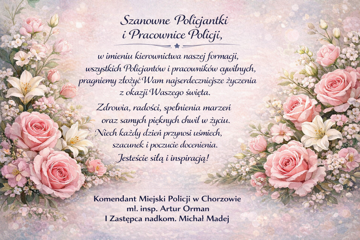 Komendant Miejski Policji w Chorzowie młodszy inspektor Artur Orman wraz z swoim Pierwszym Zastępcą nadkomisarzem Michałem Madejem oraz kierownictwem chorzowskiej jednostki składają wszystkim Paniom życzenia - zdrowia, uśmiechu oraz wszelkiej pomyślności. Niech każdy dzień będzie wypełniony radością i osobistymi oraz zawodowymi sukcesami.