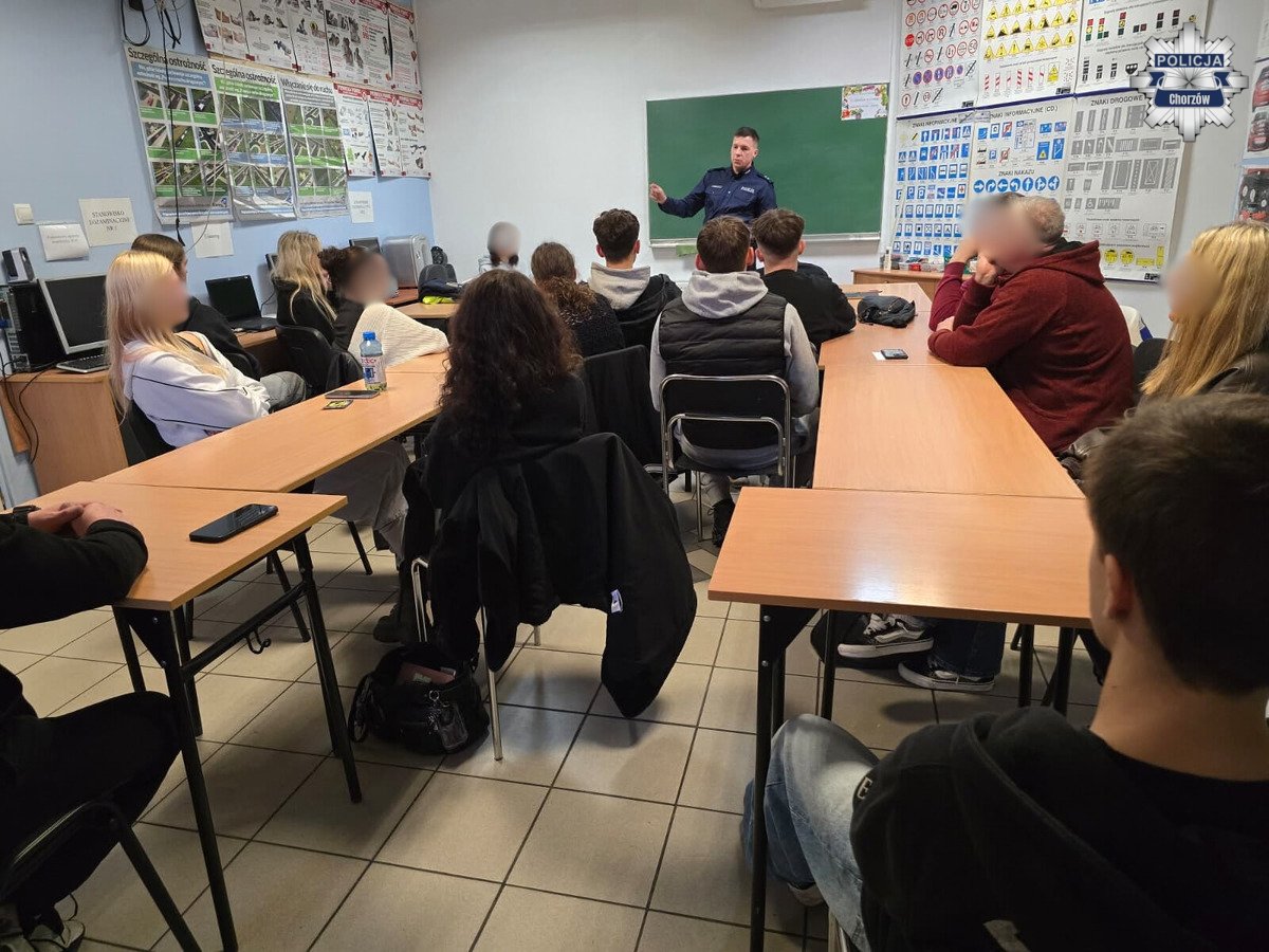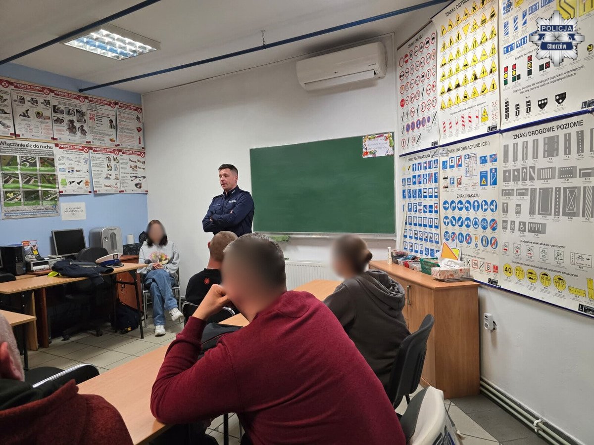 Wczoraj w jednej ze szkół nauki jazdy w Chorzowie odbyło się spotkanie poświęcone bezpieczeństwu w ruchu drogowym. Uczestniczyły w nim osoby, które niedawno rozpoczęły kurs prawa jazdy. Z kursantami spotkał się policjant ruchu drogowego podkomisarz Sebastian Walicki.