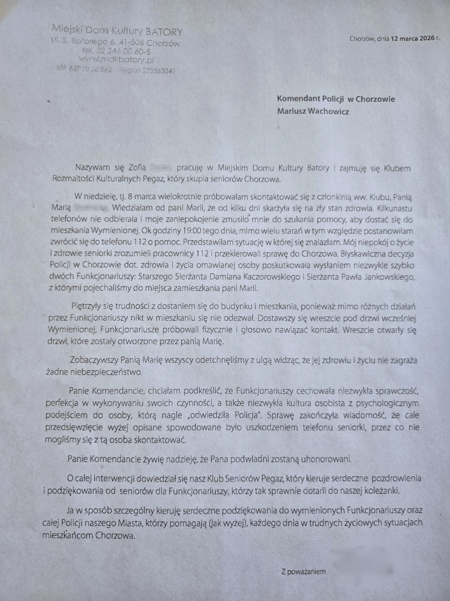 Na ręce Komendanta Komisariatu Policji II w Chorzowie wpłynęły podziękowania dla policjantów z chorzowskiej „dwójki”, którzy przeprowadzili interwencję zgłoszoną przez panią Zofię zaniepokojoną o stan zdrowia jednej z członkiń Klubu Rozmaitości Kulturalnych Pegaz, z którą od dłuższego czasu nie mogła się skontaktować. Poniżej publikujemy treść podziękowań.