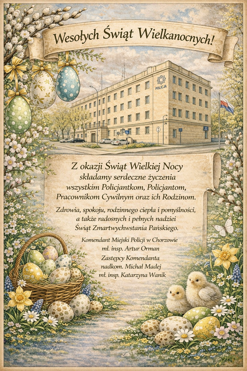 Z okazji Świąt Wielkanocnych najlepsze życzenia dla wszystkich policjantów, pracowników cywilnych i ich rodzin. Niech ten szczególny czas przyniesie szczęście i spokój a uśmiech i optymizm towarzyszy Wam każdego dnia. Samych ciepłych i radosnych chwil przy wielkanocnym stole życzy Komendant Miejski Policji w Chorzowie wraz z swoimi Zastępcami