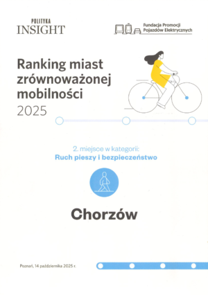 Miasto Chorzów zdobyło II miejsce w ogólnopolskim Rankingu Miast Zrównoważonej Mobilności 2025 w kategorii „Ruch pieszy i bezpieczeństwo”. Brano pod uwagę ilość zdarzeń z udziałem pieszych, ale też wprowadzane przez miasto programy zwiększania bezpieczeństwa czy regulacje dotyczące szkolnych ulic.