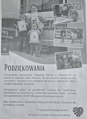 Na ręce Komendanta Miejskiego Policji w Chorzowie wpłynęły podziękowania za udział policjantów w Dniu Dziecka zorganizowanym przez Specjalistyczny Punkt Wczesnej Rewalidacji. Obecność policjantów została bardzo ciepło przyjęta i przyczyniła się do stworzenia radosnej oraz bezpiecznej atmosfery podczas wydarzenia. Poniżej publikujemy treść podziękowań.